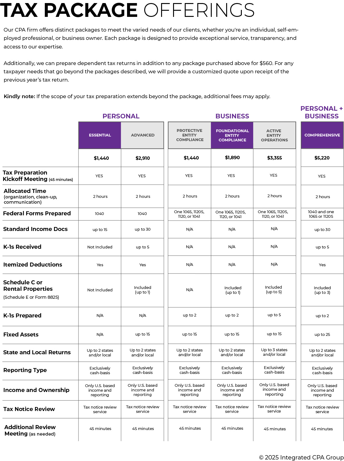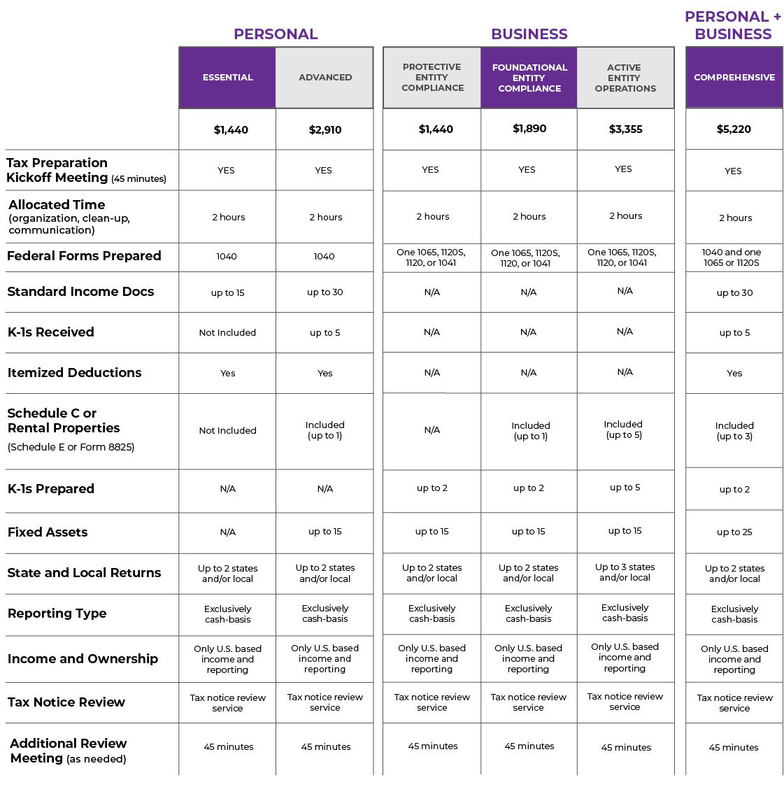 Kindly note: If the scope of your tax preparation extends beyond the package, additional fees may apply.